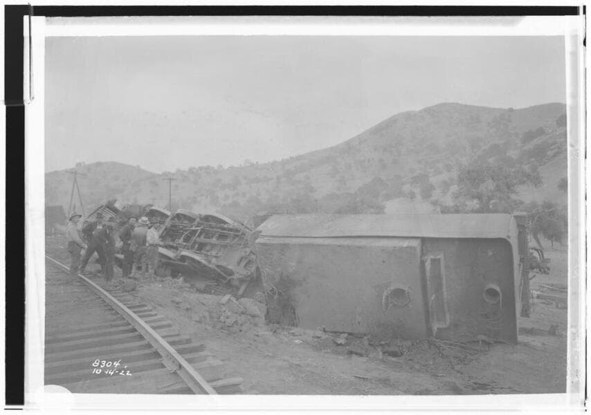 T3.2 Transportation - S.J.&E. R.R. - Train wreck at Dry Creek (10/13/22) - Engine #201. Crane is lifting wreakage back to railcars