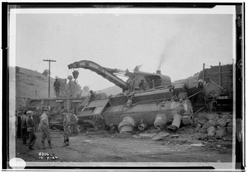 T3.2 Transportation - S.J.&E. R.R. - Train wreck at Dry Creek (10/13/22) - Engine #201. Crane is lifting wreakage back to railcars