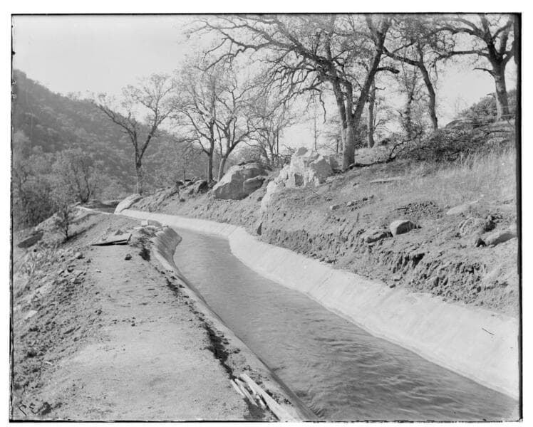 A ditch full of water at Kaweah #2 Hydro Plant. The photo shows hills and rocks in the background, ca. 1904.