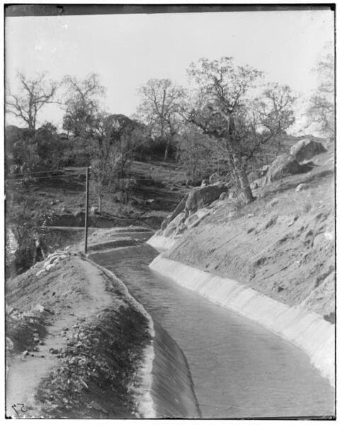 View of Station 180, with the canal in the foreground and the flume in the background, at Kaweah #2 Hydro Plant, showing the mountains in the background, November 10, 1904.