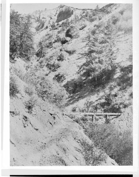 The raceway flume joining the tailrace of Mill Creek #2 Hydro Plant and Mill Creek #3 Hydro Plant with the intake of Mill Creek #1 Hydro Plant. [showing the mountains and the canyon.]