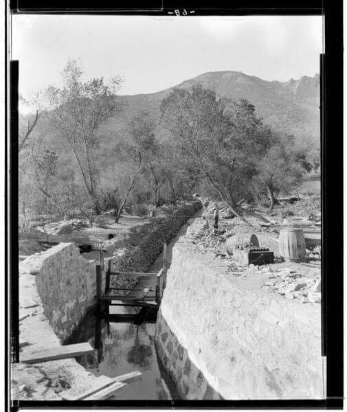The reservoir at Kaweah #2 Hydro Plant, showing a gate and mountains in the background, November 10, 1904.