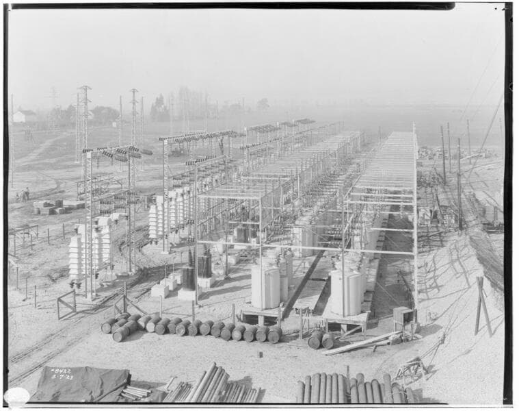 Laguna Bell Substation - Westinghouse, "Corncob" Oil Switch test at Laguna Bell. Group photo of men standing in transformer racks.