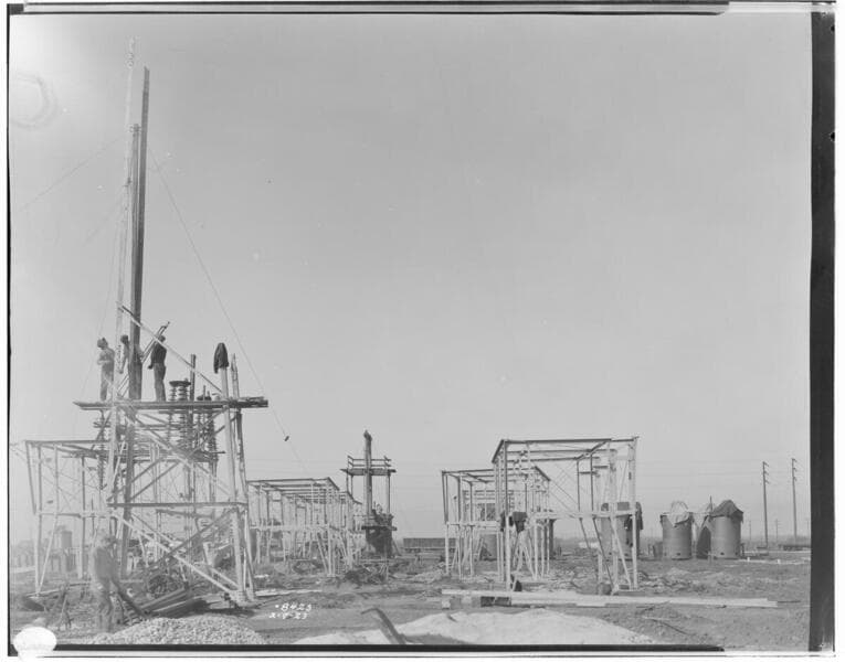 Laguna Bell Substation - Westinghouse, "Corncob" Oil Switch test at Laguna Bell. Group photo of men standing in transformer racks.