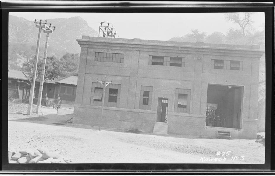 View of the power house at Kaweah #3 Hydro Plant, showing water in the tailraces.
