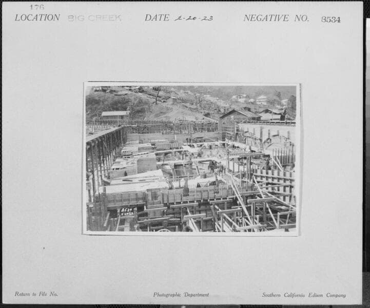 Big Creek Powerhouse #3 - Construction of Powerhouse #3 substructure at Generator Floor, showing yard layout and concrete plant.