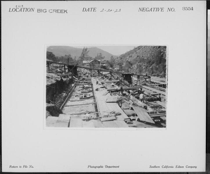 Big Creek - Powerhouse #3 (part 1) [first forms up on powerhouse, staging and concrete plant, Switching Station, powerhouse steel framework, generator floor, draft tube construction, incline, views from above, penstock construction, Tunnel 3, CO2 equipment on Unit 3, Penstock binding, dispatcher's building, manifold assembly, oil circuit breakers, transformers, Dam 6 spilling, completed Powerhouse 3.]