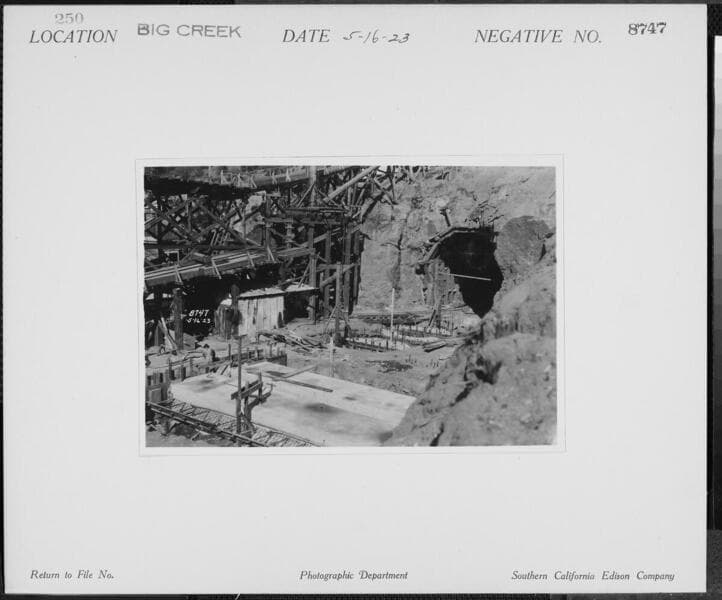 Big Creek Powerhouse #3 - Tunnel #3 outlet portal - excavation for manifold - Camp 37 in background.