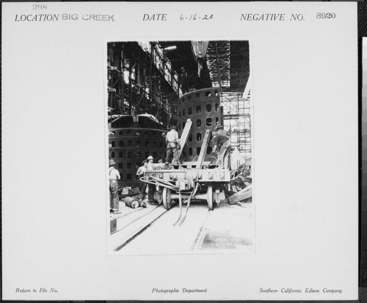 Big Creek Powerhouse #3 - Half of stator #2 [on rail car moving into PH#3 with forms up].