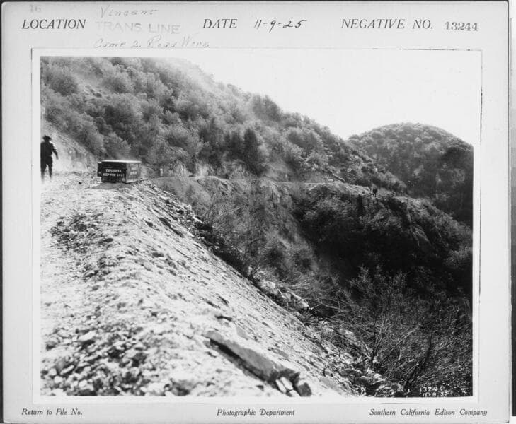 Vincent Transmission line - View across upper Arroyo Seco near Oak Wilde. Construction road at upper left with "Fire Break Ridge" camp.