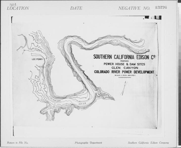 Colorado River - Map showing proposed powerhouses and dam sites for Glen Canyon, Colorado River Power Development.