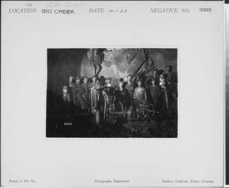 Big Creek, Florence Lake Dam - Miners in Florence Tunnel "Heading Bench, Camp 63, Big Creek".