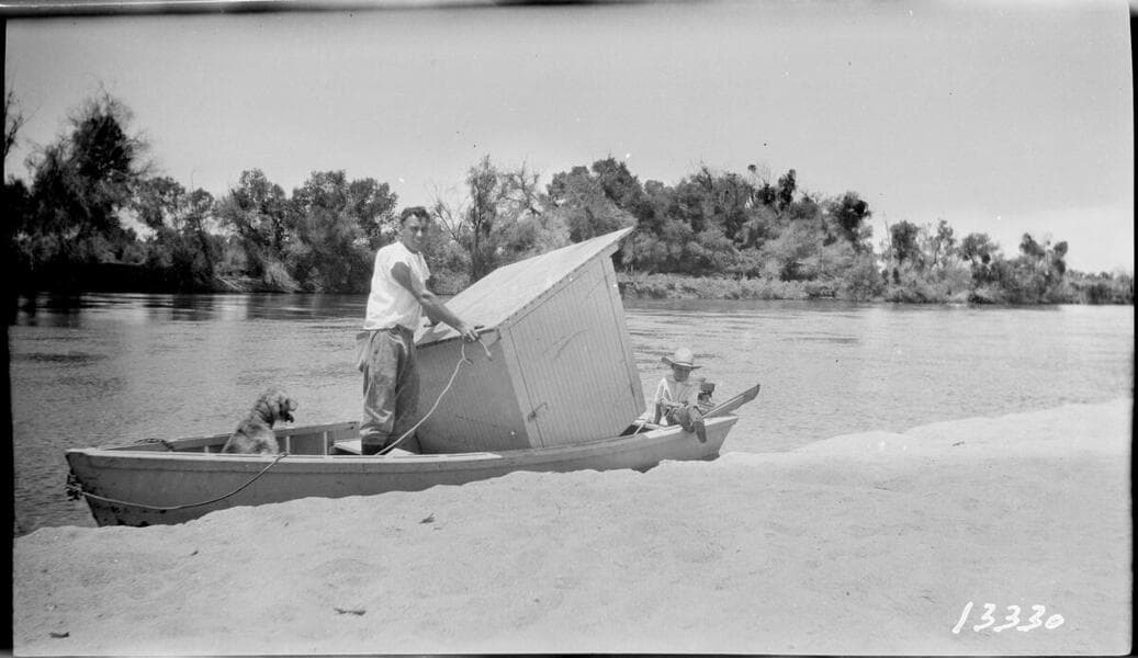 Big Creek, Herminghaus Ranch - Herminghaus Estate - Man and boy by motor boat on bank of waterway.