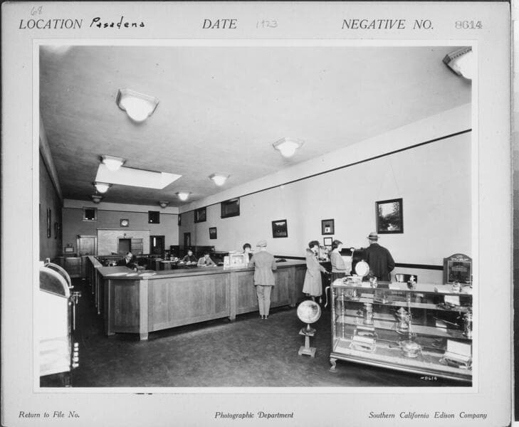 Local Offices A-Z - Pasadena Edison Office interior with displays of lightbulbs and appliances.
