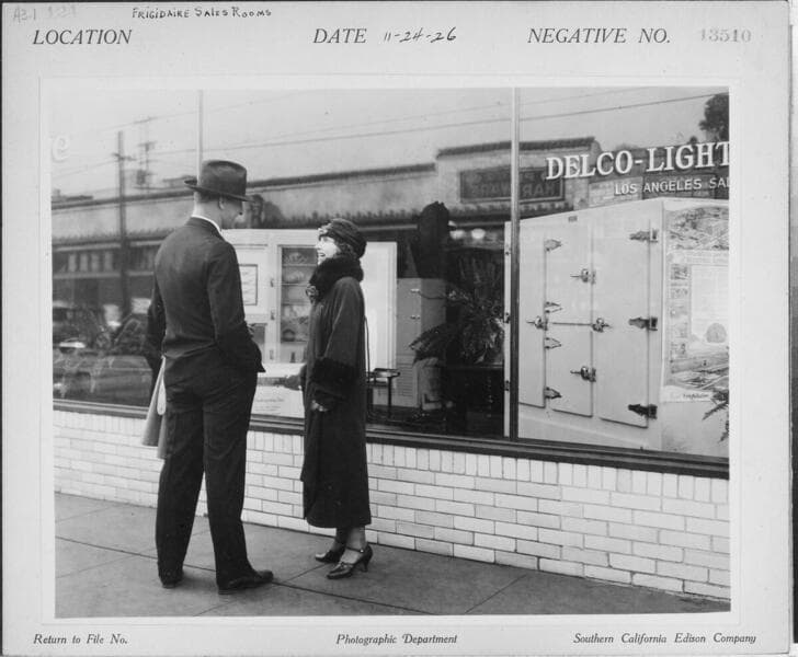 A3.1 - Appliances miscellaneous - Stills taken at Frigidaire Sales Rooms [husband & wife sampling food from refrigerator].