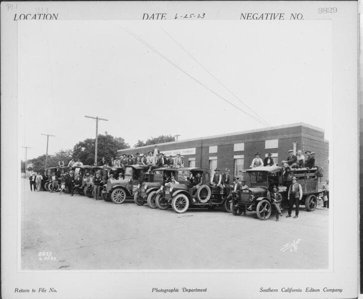 P1.1 - Group Portraits - The underground gang in Los Angeles [sitting on and around open Southern California Edison Company trucks with chain drives].