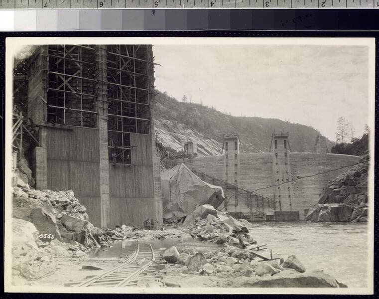 Big Creek Powerhouse #3 - Dam 6 near completion, with Intake 3 construction in background, taken from road on downstream side.