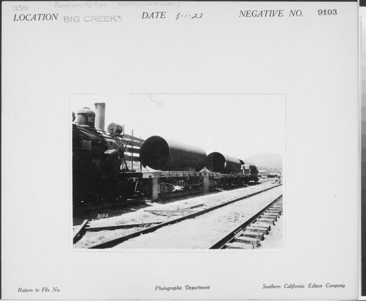 Big Creek Powerhouse #3 - Penstock #3 pipe sections brought in on transcontinental flatcars and unloaded at railroad yard in Auberry. They were then taken to Big Creek on the SJ&E RR.