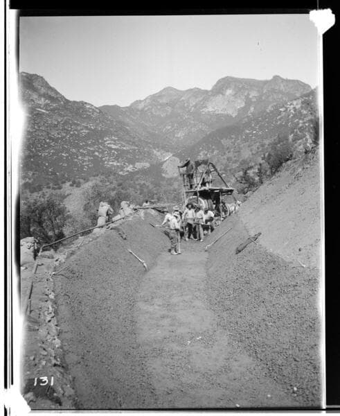 A construction crew excavating for the main conduit route at Kaweah #3 Hydro Plant, showing the mountains in the background, ca. 1913.