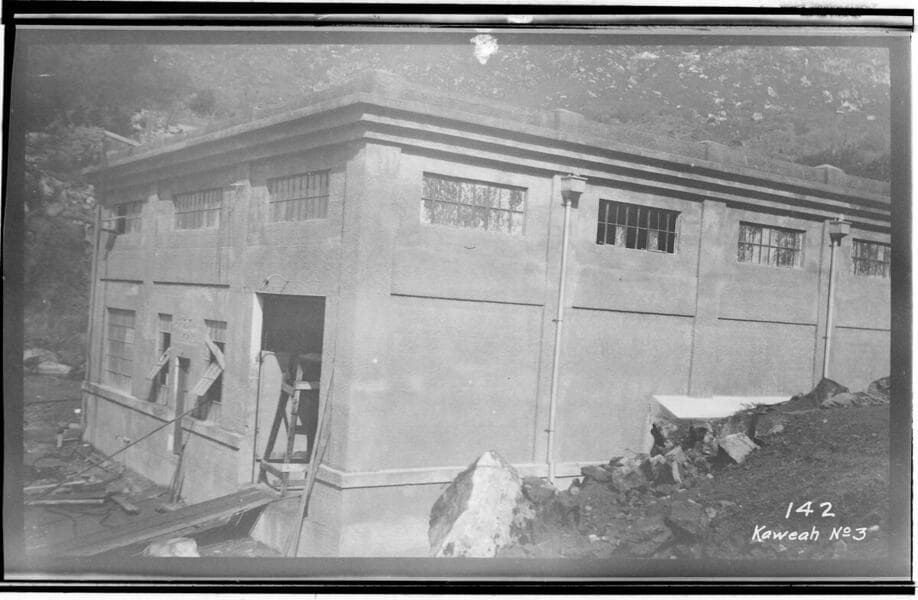 Side view of Kaweah #3 Power House while under construction, showing construction materials, ca. 1913.