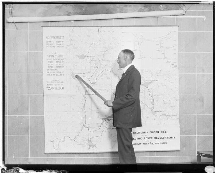 C1.3 - Maps - Mr. Barre at map showing proposed development of the San Joaquin River and Big Creek. He is pointing to Florence Lake Reservoir.