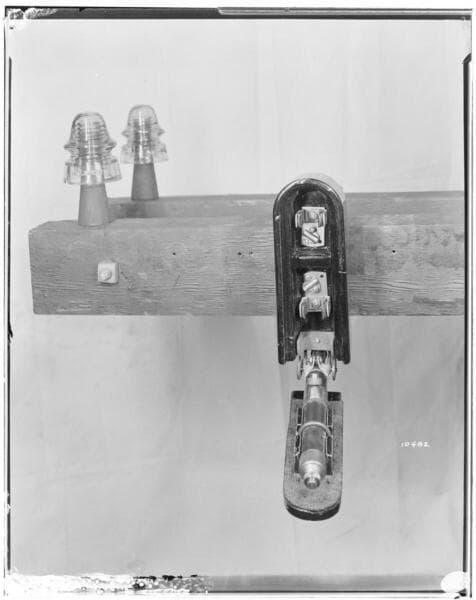 Distribution, Underground - Types of insulators and Pothead on pole crossarm.
