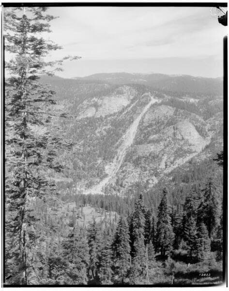 Big Creek Powerhouse #1 - [penstocks and Kerckhoff Dome from road across Big Creek].