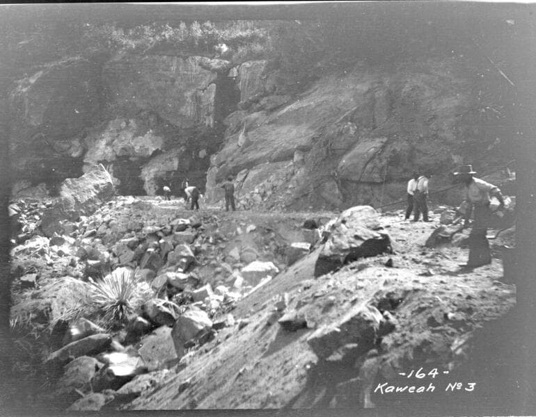 Excavating along the main conduit at Kaweah #3 Hydro Plant, ca. 1913. The photo is slightly out of focus and does not show much detail.