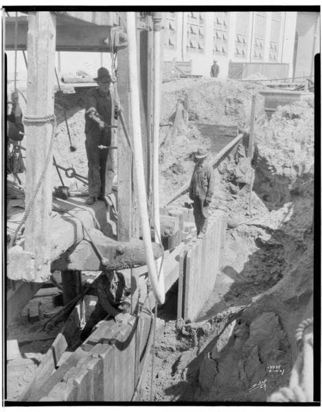 Long Beach Steam Station, Plant #3 - Driving sheet piling around sump hole - close-up.