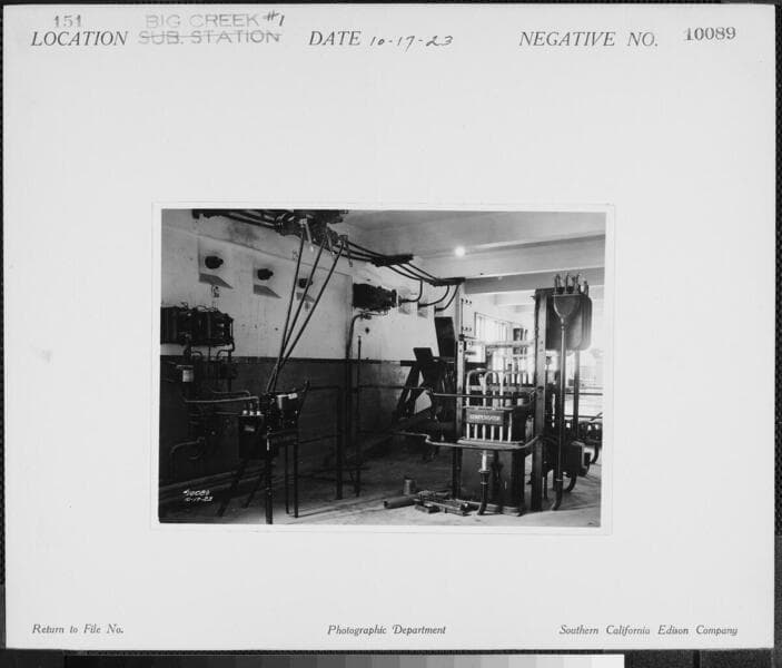 Big Creek - Hydroelectric project photos [Big Creek - commercial postcards, Powerhouse 1 & 2, exciter, gate control, generator floor, Cascada cottages, Dam #4, SJ&E train nearing Cascada, train coming into Cascada station, Bear Creek, Pitman Creek, Magunden Sub.; Kaweah #3 Switchboard; Toronto Power Co. - Niagara Powerhouse generator floor, Transformer Station, #8 Governor, Switchboards, switchrack, magnetic relays, forebay; Front Street Power Station (AC side, and DC side)]