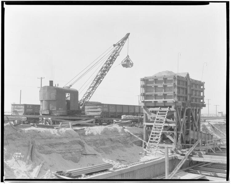Long Beach Steam Station, Plant #3 - Lowering concrete wall into place.