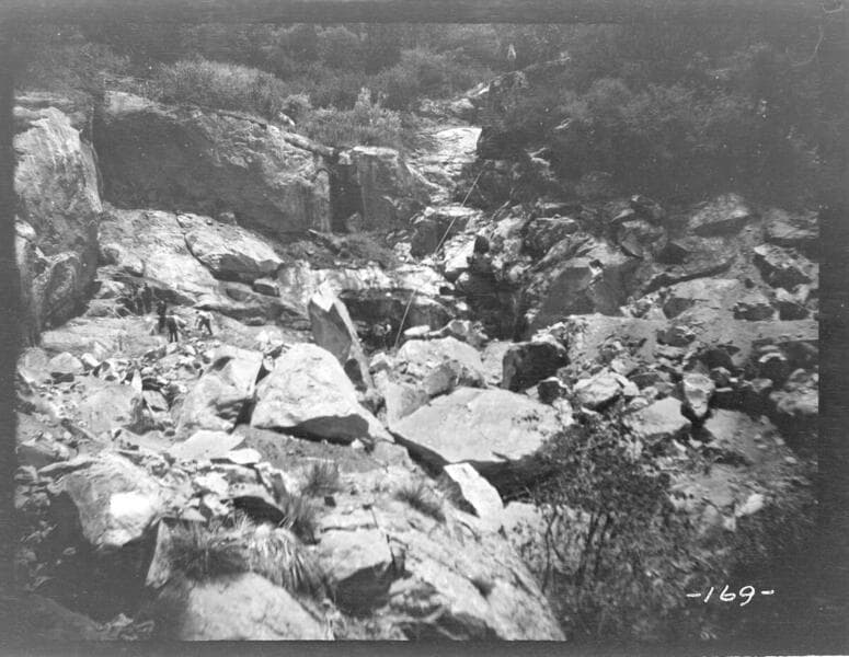 Excavating along the main conduit at Kaweah #3 Hydro Plant, ca. 1913. The photo is slightly out of focus and does not show much detail.