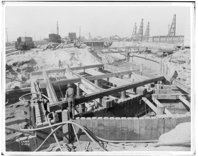 Long Beach Steam Station, Plant #3 - driving sheet piling in outlet tunnel.