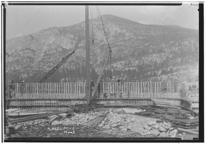 Big Creek, Florence Lake Dam - Looking upstream at end of Buttresses and arches under construction [in river section].