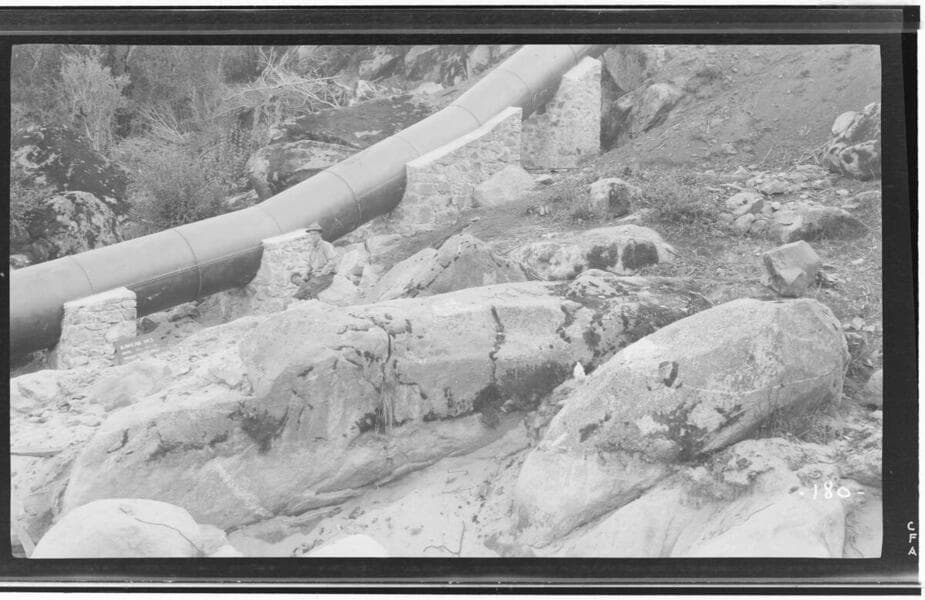 A long view of the pressure pipe at Kaweah #3 Hydro Plant before backfilling, ca. 1913.
