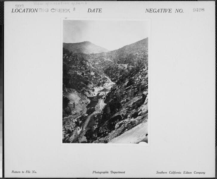 Big Creek Powerhouse #8 - [View down river of powerhouse #8 and penstocks on left, and Dam 6 below.]