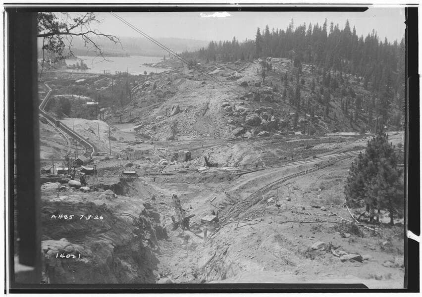 Big Creek, Shaver Lake Dam - Looking north from south end of Shaver Dam, showing concrete poured in shallow trench between extreme south end of dam and the small tower.