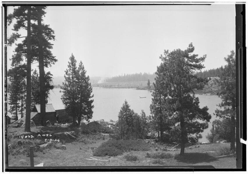 Big Creek, Shaver Lake Dam - Looking south across Shaver Dam as it appeared on May 2nd, 1927. Please note the small house for water recorder at the left-hand side of the pond between the old and new dams. The smoke in the upper left-hand corner of the picture is that of the Bretz Brothers burning in clearing the reservior.