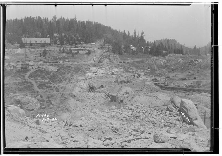 Big Creek, Huntington Lake Dams - Dam #2 - Looking down on buried valve house on Huntington-Shaver Conduit.