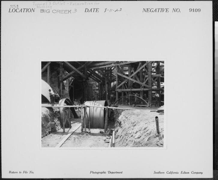 Big Creek Powerhouse #3 - Tunnel #3 outlet portal - excavation for manifold - Camp 37 in background.