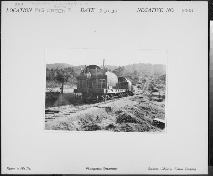 Big Creek Powerhouse #3 - Penstock 3 - transferring pipe from railcar.