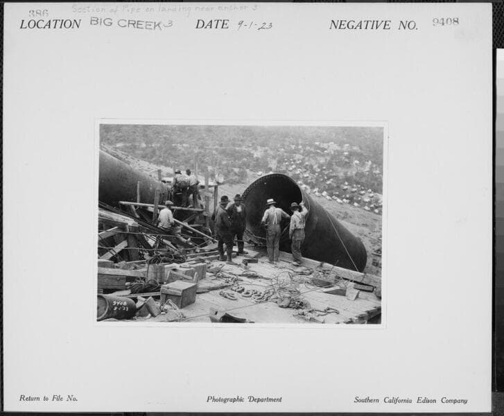 Big Creek Powerhouse #3 - Placing section of penstock 3 pipe showing Camp 38 and operator's cottages in background.