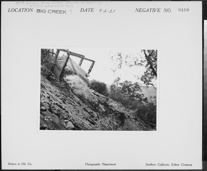 Big Creek Powerhouse #3 - 100 [?] cfs of water - Flume at beginning of sluicing operations at Camp 37.
