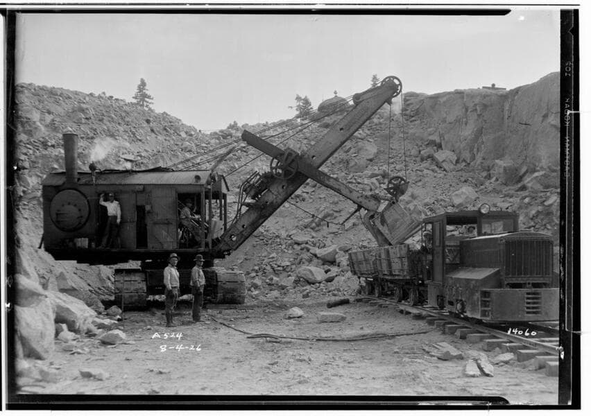 Big Creek, Shaver Lake Dam - Close-up of the excavation in the bottom section of the Shaver Lake Dam. The gasoline shovel has actively started to work.