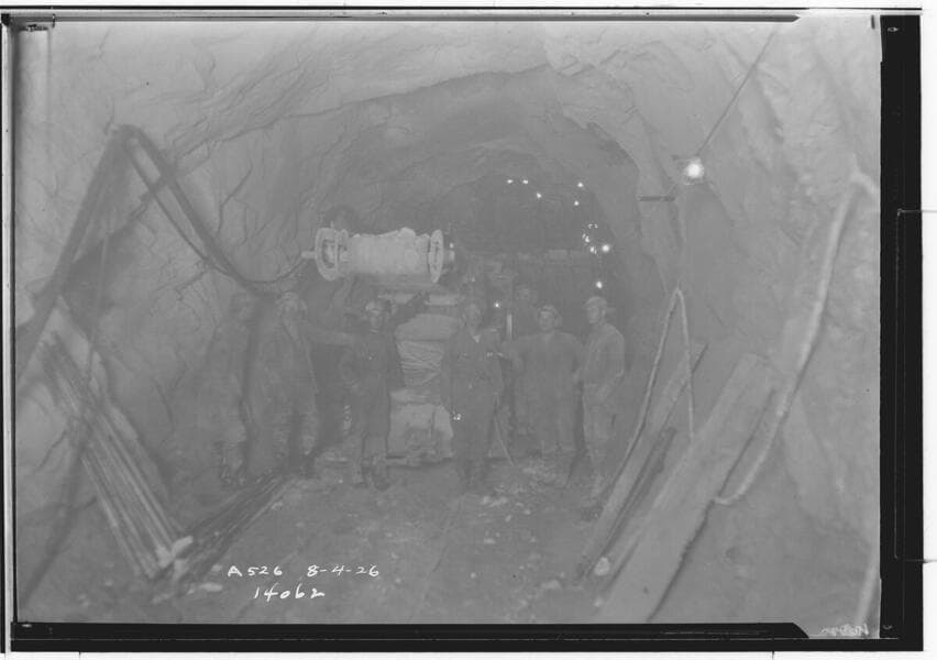 Big Creek, Huntington-Pitman-Shaver Diversion - Bucyrus Shovel and workmen in Tunnel [#7].