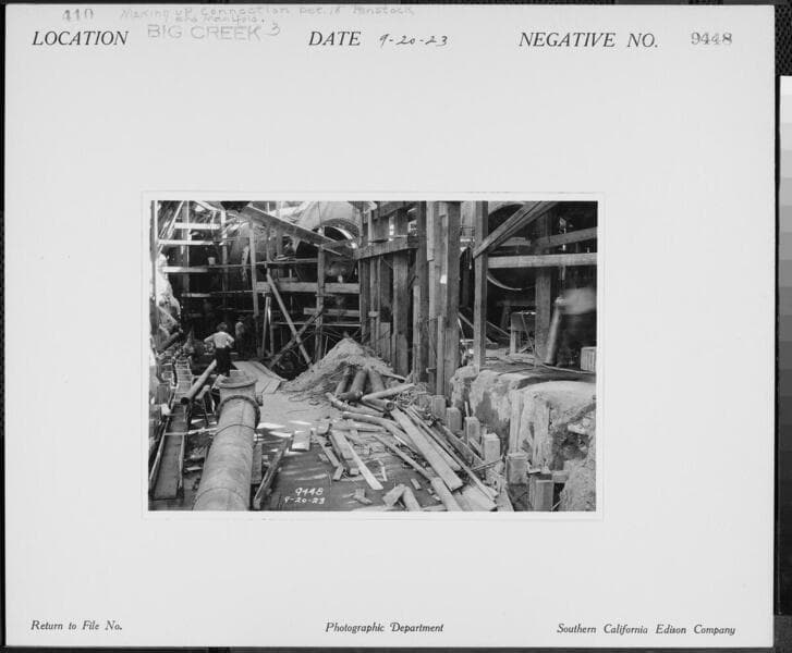 Big Creek - Powerhouse #3 (part 1) [first forms up on powerhouse, staging and concrete plant, Switching Station, powerhouse steel framework, generator floor, draft tube construction, incline, views from above, penstock construction, Tunnel 3, CO2 equipment on Unit 3, Penstock binding, dispatcher's building, manifold assembly, oil circuit breakers, transformers, Dam 6 spilling, completed Powerhouse 3.]