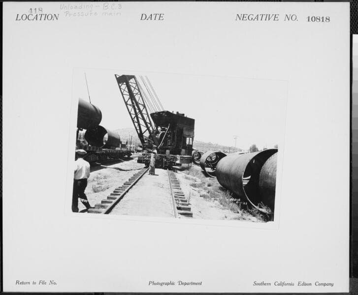 Lytle Creek, Fontana Powerhouse - Unloading 36" diameter sections of steel penstock pressure pipe for Fontana Power Company.