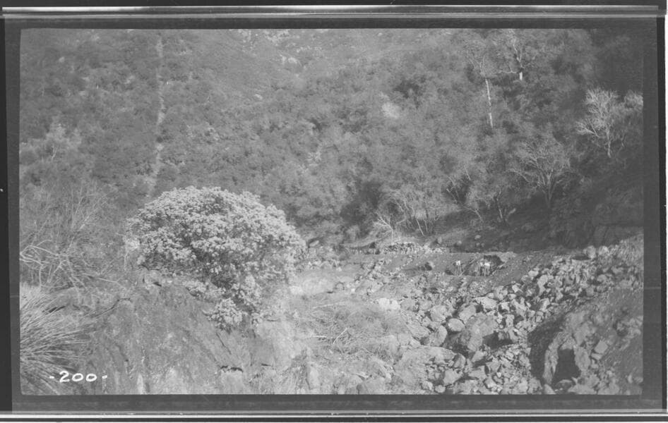 A construction crew excavating for the main conduit route at Kaweah #3 Hydro Plant, ca. 1913. The photo is washed out.