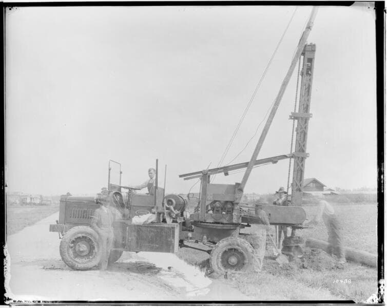 Distribution Lines - Earth boring machine on truck. [for drilling holes and placing poles] and G. Haven Bishop [with camera and tripod taking a photo from the road].