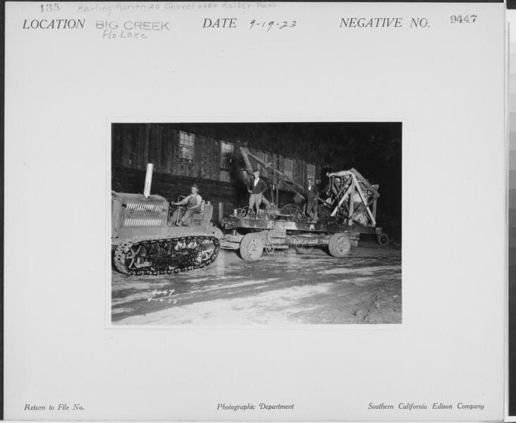 Big Creek, Florence Lake Dam - Macco Co. Northwest 1 1/4 cubic yard Shovel mounted on tractor trailer for transport over Kaiser Pass.
